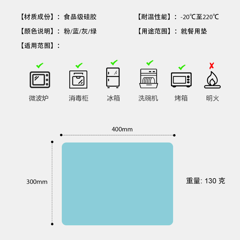 您的位置:首頁 > 產品中心 > 硅膠廚具用品 > 餐墊 > 硅膠餐墊 40*30食品級硅膠兒童餐墊隔熱學生桌墊