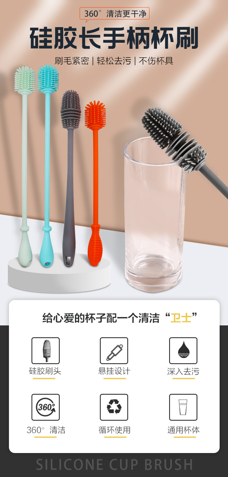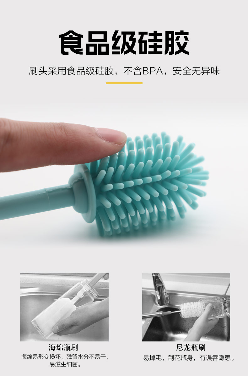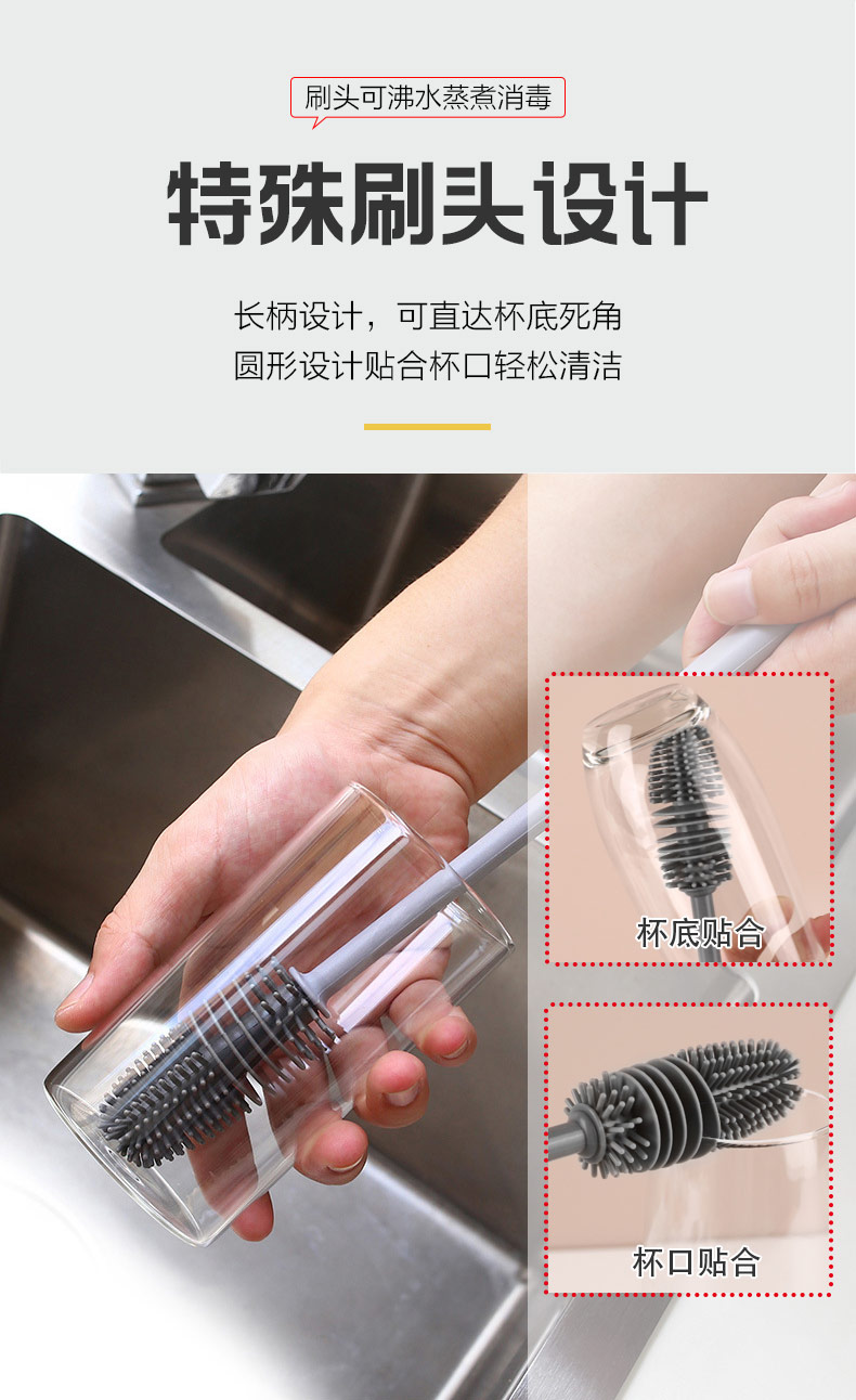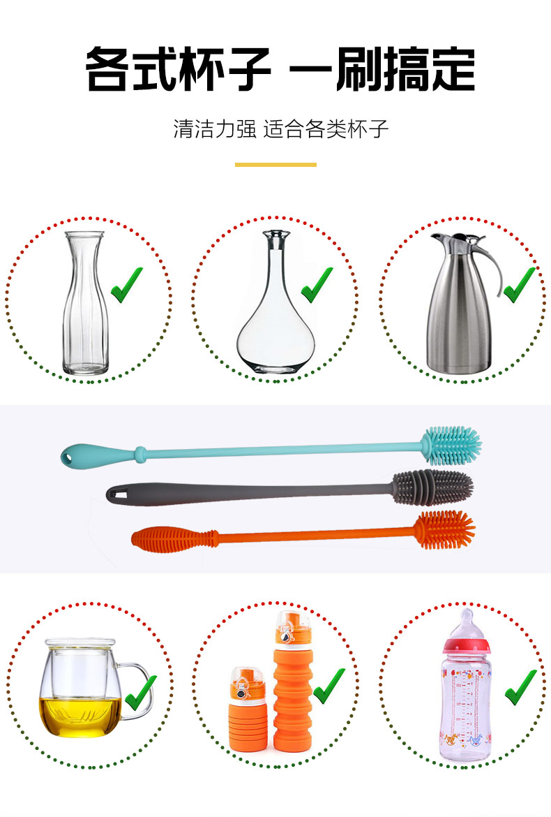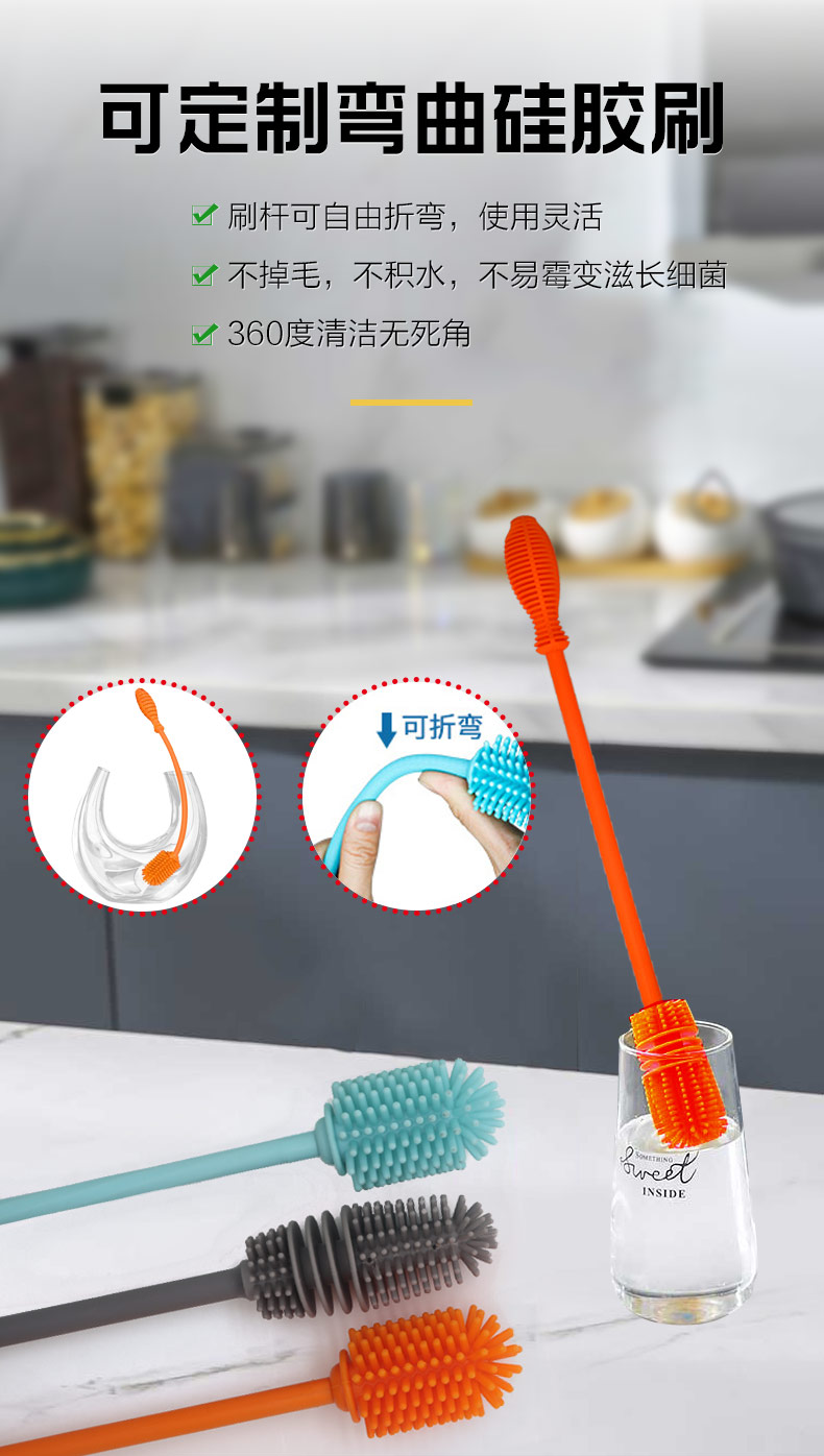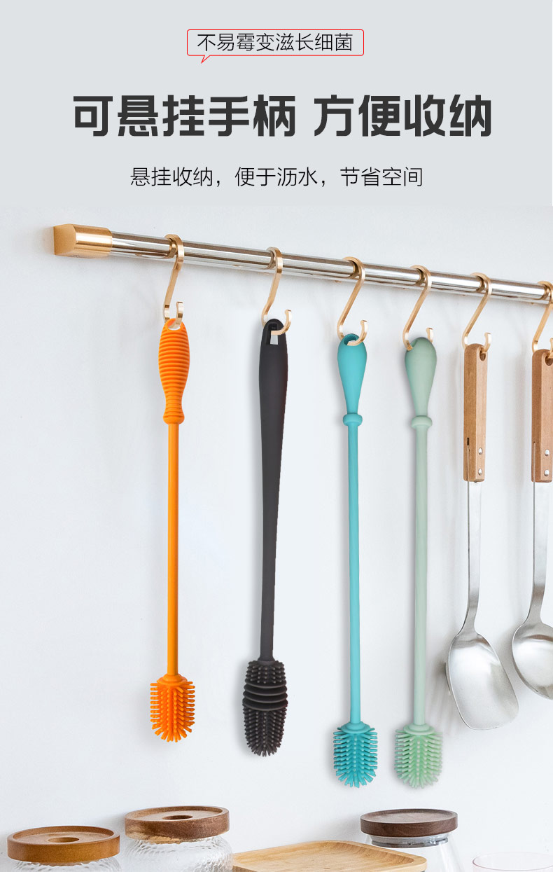 給心愛的杯子配一個硅膠刷,可以360度清潔水杯內(nèi)壁,刷頭采用食品級硅膠,不含BPA,無異味,相比海綿瓶刷不容易變形,不容易殘留水分滋生細菌。適合各類杯子的清潔??铺├鳛橐患夜枘z制品OEM廠家,有能力也有條件定制可彎頭的硅膠刷,人性化的設(shè)計,易懸掛便利瀝水,節(jié)約空間。