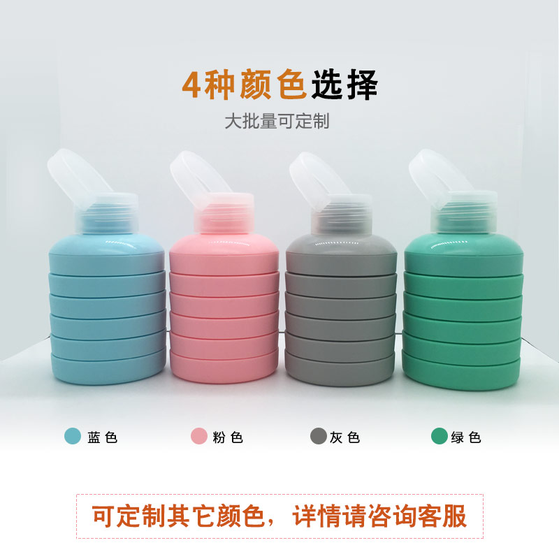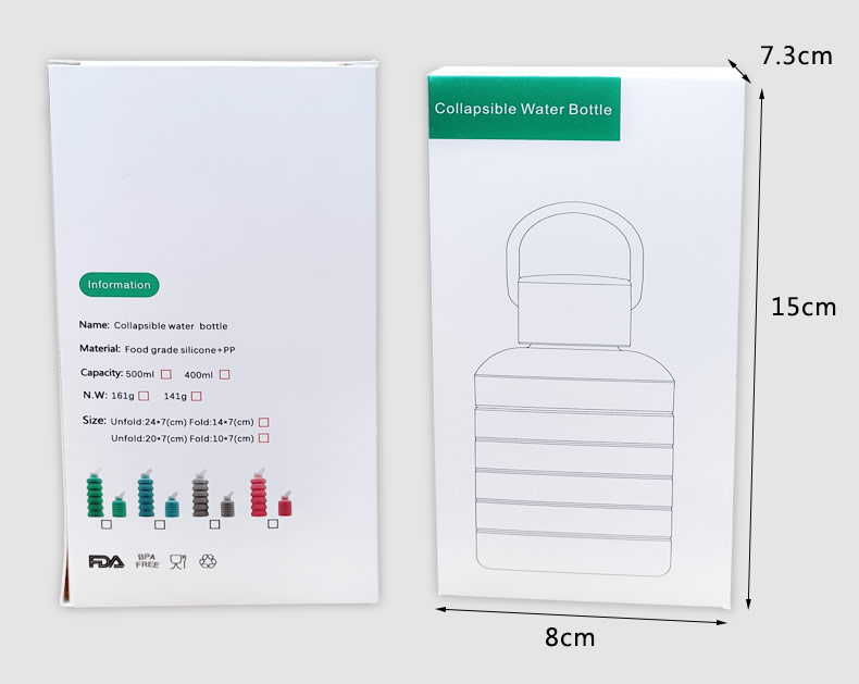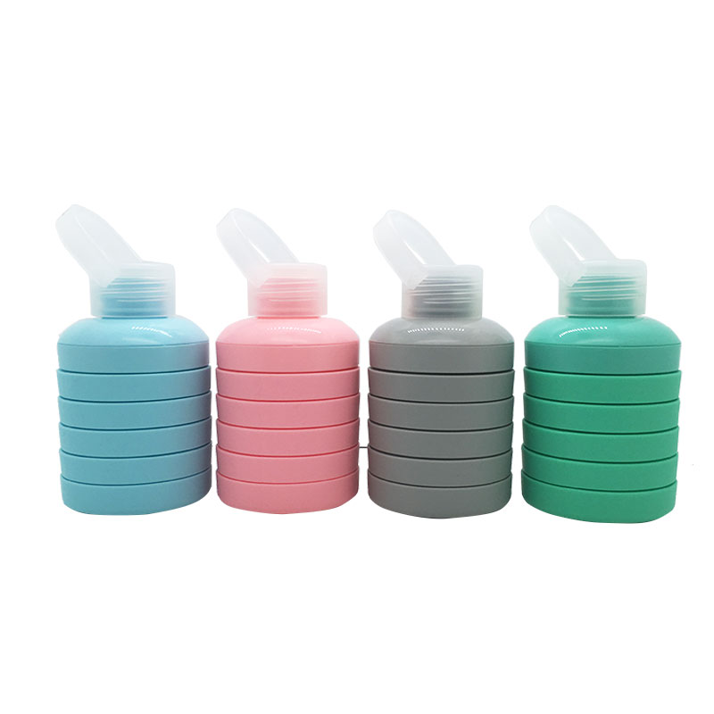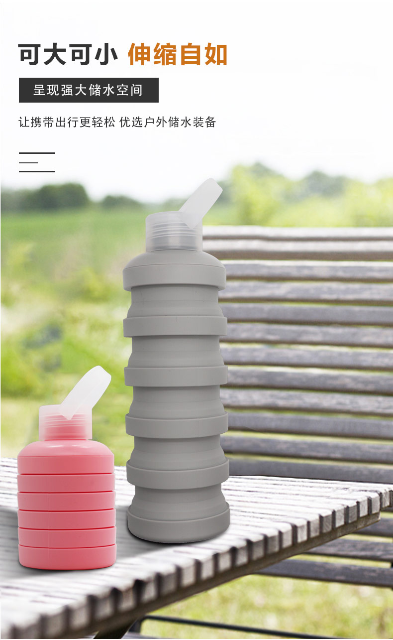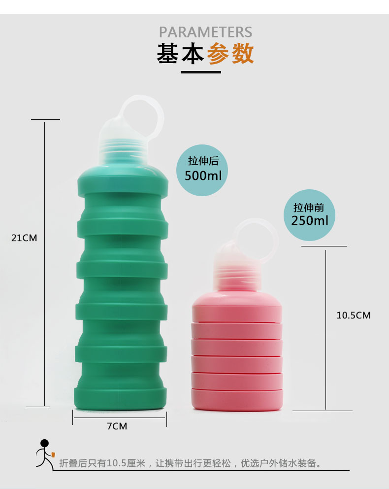 便攜式硅膠折疊水瓶采用食品級硅膠材質,符合食品級標準,符合相關質檢標準,這款運動折疊水瓶是本公司2021年最新研發生產的硅膠制品,顏色目前只生產了4種,分別為灰色,綠色,藍色,粉紅色,瓶蓋為白透明色,也可以根據要求來定制各種材質或者是不同形狀的瓶蓋顏色或者是樣式。可裝熱水,方便旅行攜帶,具有耐摔,耐高溫,柔軟等特點。